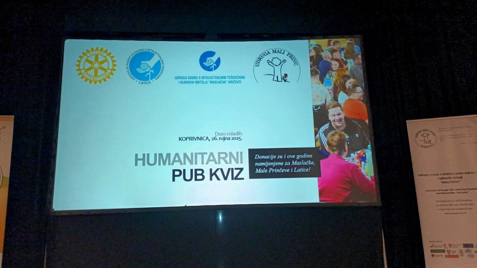 Subotnja večer 26. rujna bila je rezervirana za gala priredbu humanitarnog karaktera. U Domu mladih u Koprivnici se tom prigodom okupilo 40-ak ekipa znalaca na tradicionalnom izdanju PUB KVIZA u organizaciji Rotary kluba Koprivnica i koprivničkog Gradskog komunalnog poduzeća Komunalac. Ljubitelji znanja okupljeni u timove od 5-6 sudionica i sudionika svojim vrhunskim znanjem prikupljali su financijska sredstva namijenjena radu udruga osoba s intelektualnim teškoćama i njihovih obitelji i to za Latice iz Koprivnice, Maslačak iz Križevaca i Mali Princ iz Đurđevca. Ovaj gotovo dvosatni događaj uspio je u svojoj namjeri pa je za naše udruge skupljen solidan iznos koji će one između sebe jednako podijeliti. U govorima zahvale istaknuto je da će se sredstva namjenski iskoristiti za poboljšanje uvjeta života i rada članova i korisnika usluga koje udruge pružaju. Tradicionalni PUB KVIZ pokazao je veliko srce svih nas, a sudeći prema odzivu, sljedeći godine mogao bi organizacijski biti znatno većeg opsega. Hvala svima!