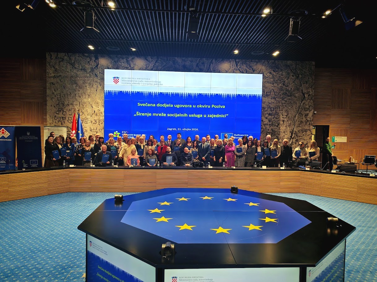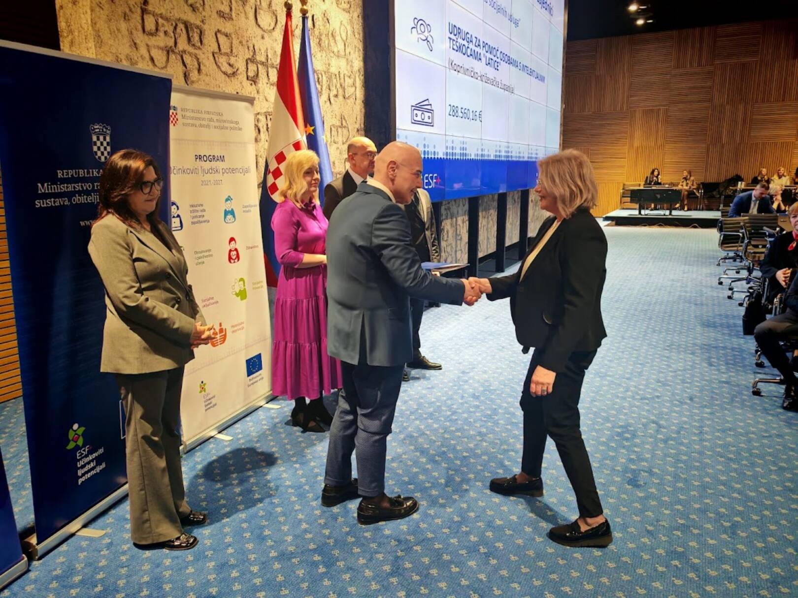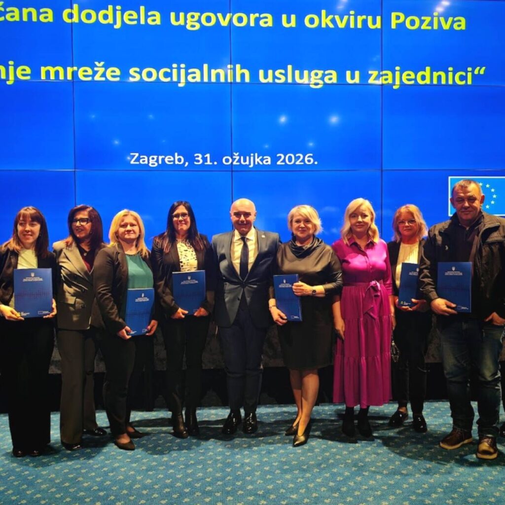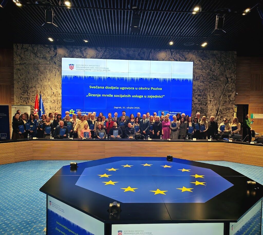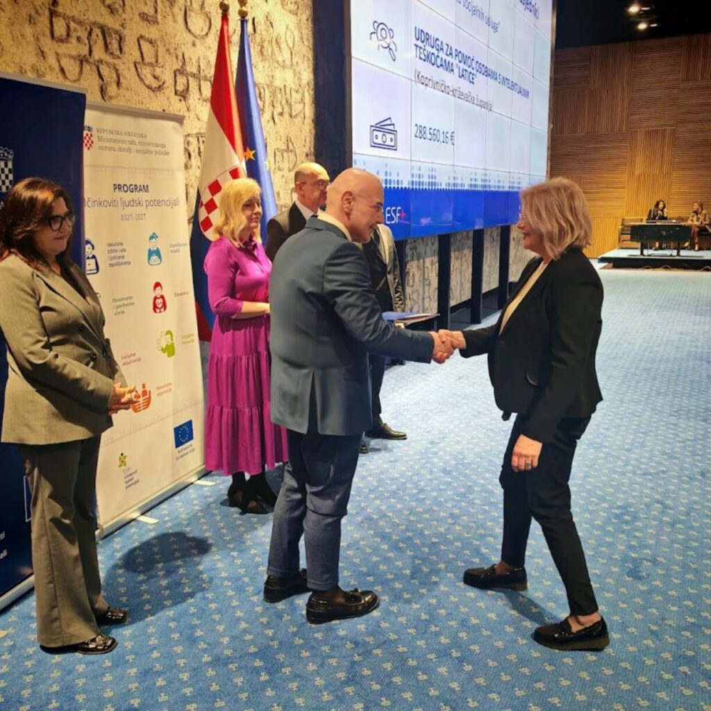 S ponosom objavljujemo da krećemo s realizacijom našeg novog EU projekta! U utorak 31. ožujka nam je uz svečano potpisivanje uručen ugovor novog EU projekta, na temelju Poziva „Širenje mreže socijalnih usluga u zajednici“. U projektu pod nazivom Otvorena vrata socijalnih usluga SF.3.4.11.04.0044 usmjerit ćemo se na rješavanje problema nedostatne dostupnosti i raznolikosti socijalnih usluga za odrasle osobe s intelektualnim teškoćama i starije osobe na području Koprivnice i okolnih mjesta. Učinit ćemo to kroz provedbu različitih aktivnosti za podizanje kvalitete njihova života i socijalne uključenosti. Ciljanu skupinu ovog projekta čine 35 odraslih osoba s intelektualnim teškoćama te 63 starije osoba s područja grada Koprivnice i okolnih mjesta, odnosno sveukupno 98 osoba. U Kongresnom centru Nacionalne i sveučilišne knjižnice u Zagrebu, Predsjednici Udruge Latice i podpredsjedniku Draženu Novačiću ugovor je uručio ministar Alen Ružić ispred Ministarstva rada, mirovinskoga sustava, obitelji i socijalne politike. Partneri na projektu su nam Grad Koprivnica te Sportska udruga za osobe s intelektualnim poteškoćama “Veliko srce”. Razdoblje provedbe je sljedećih 36 mjeseci. Ukupna vrijednost projekta je 288.560,16 €, što predstavlja i ukupan iznos bespovratnih sredstava. Voditeljica projekta ispred Udruge za pomoć osobama s intelektualnim teškoćama Latice je Nevenka Fuchs. Projekt sufinancira Europska unija iz Europskog socijalnog fonda plus, a više informacija o EU fondovima može se pronaći na poveznici: https://esf.hr/esfplus/esf/.
