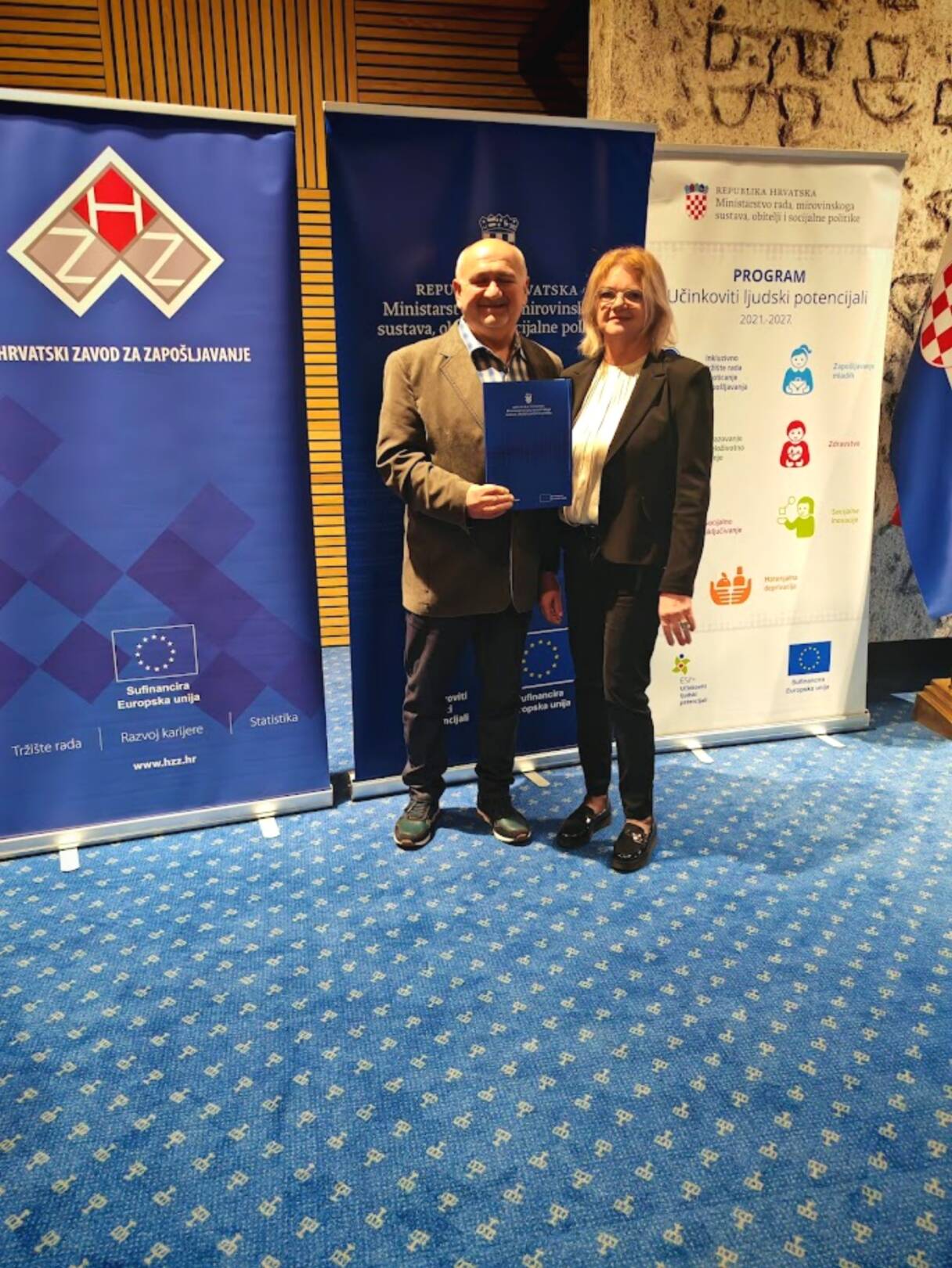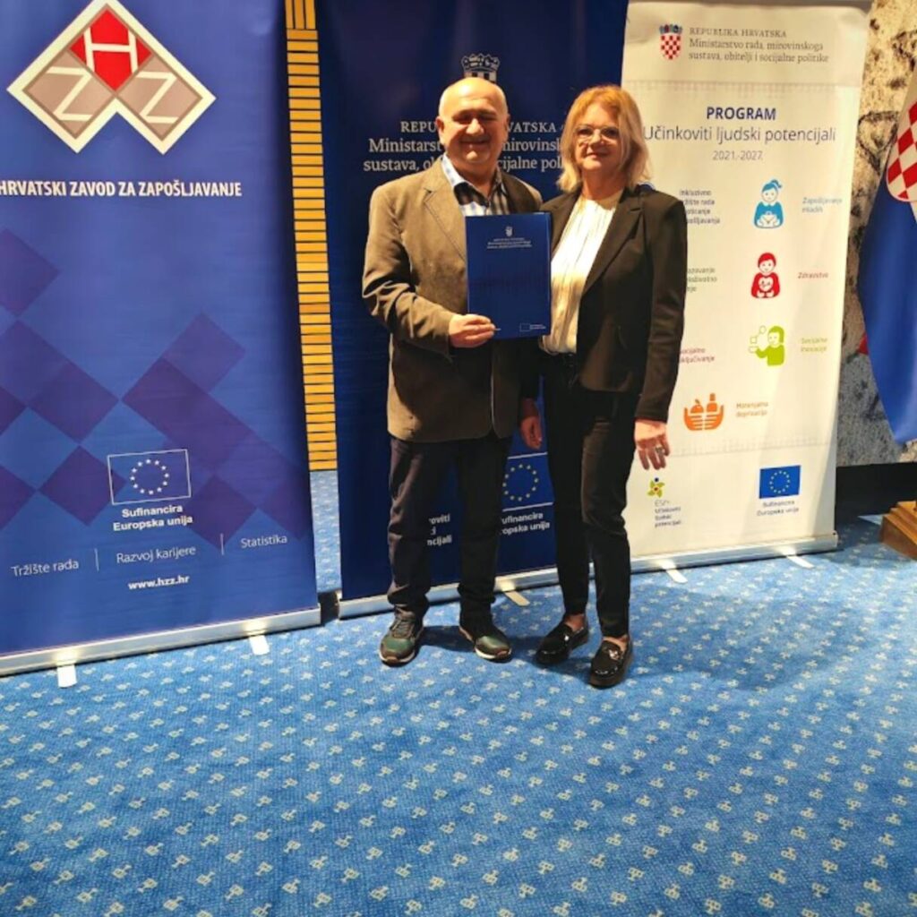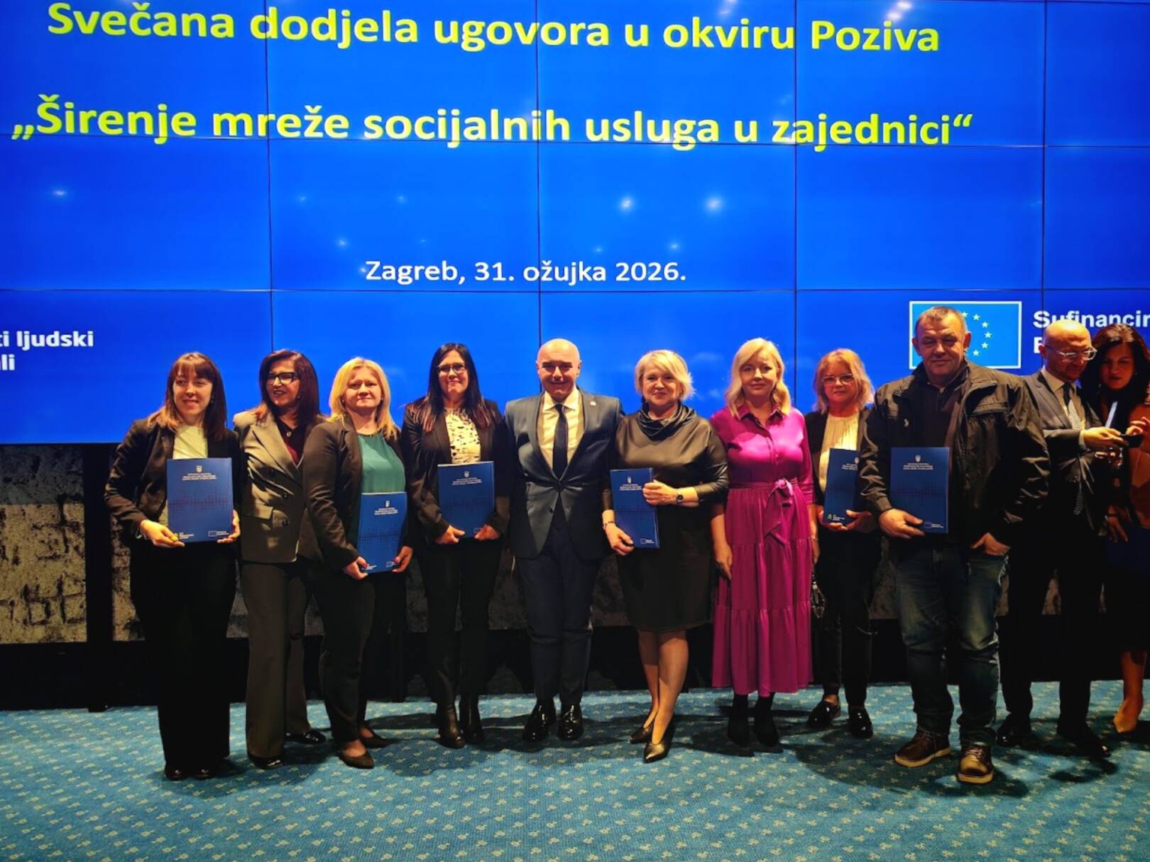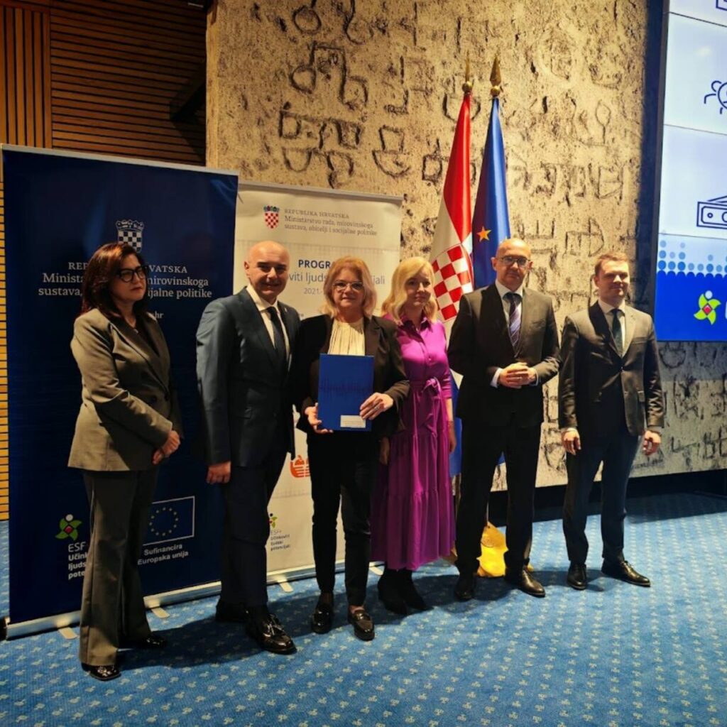 S ponosom objavljujemo da krećemo s realizacijom našeg novog EU projekta! U utorak 31. ožujka nam je uz svečano potpisivanje uručen ugovor novog EU projekta, na temelju Poziva „Širenje mreže socijalnih usluga u zajednici“. U projektu pod nazivom Otvorena vrata socijalnih usluga SF.3.4.11.04.0044 usmjerit ćemo se na rješavanje problema nedostatne dostupnosti i raznolikosti socijalnih usluga za odrasle osobe s intelektualnim teškoćama i starije osobe na području Koprivnice i okolnih mjesta. Učinit ćemo to kroz provedbu različitih aktivnosti za podizanje kvalitete njihova života i socijalne uključenosti. Ciljanu skupinu ovog projekta čine 35 odraslih osoba s intelektualnim teškoćama te 63 starije osoba s područja grada Koprivnice i okolnih mjesta, odnosno sveukupno 98 osoba. U Kongresnom centru Nacionalne i sveučilišne knjižnice u Zagrebu, Predsjednici Udruge Latice i podpredsjedniku Draženu Novačiću ugovor je uručio ministar Alen Ružić ispred Ministarstva rada, mirovinskoga sustava, obitelji i socijalne politike. Partneri na projektu su nam Grad Koprivnica te Sportska udruga za osobe s intelektualnim poteškoćama “Veliko srce”. Razdoblje provedbe je sljedećih 36 mjeseci. Ukupna vrijednost projekta je 288.560,16 €, što predstavlja i ukupan iznos bespovratnih sredstava. Voditeljica projekta ispred Udruge za pomoć osobama s intelektualnim teškoćama Latice je Nevenka Fuchs. Projekt sufinancira Europska unija iz Europskog socijalnog fonda plus, a više informacija o EU fondovima može se pronaći na poveznici: https://esf.hr/esfplus/esf/.