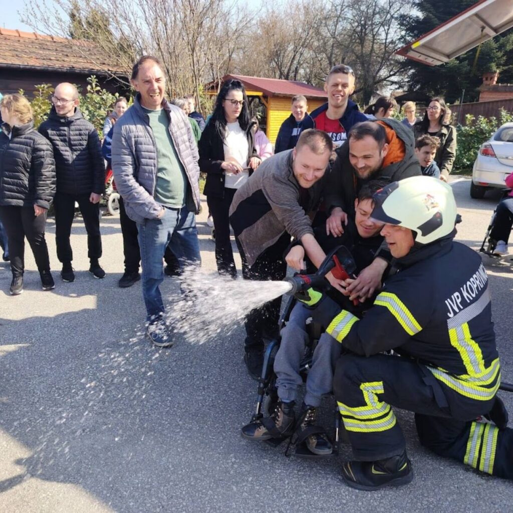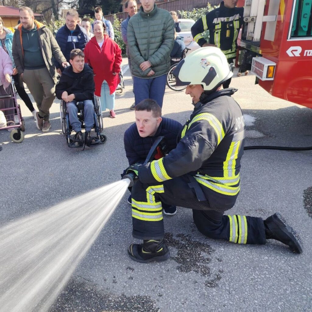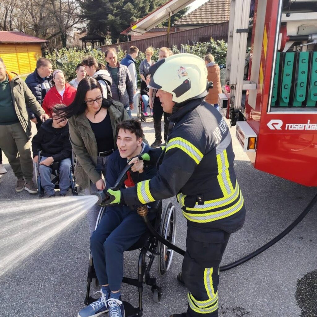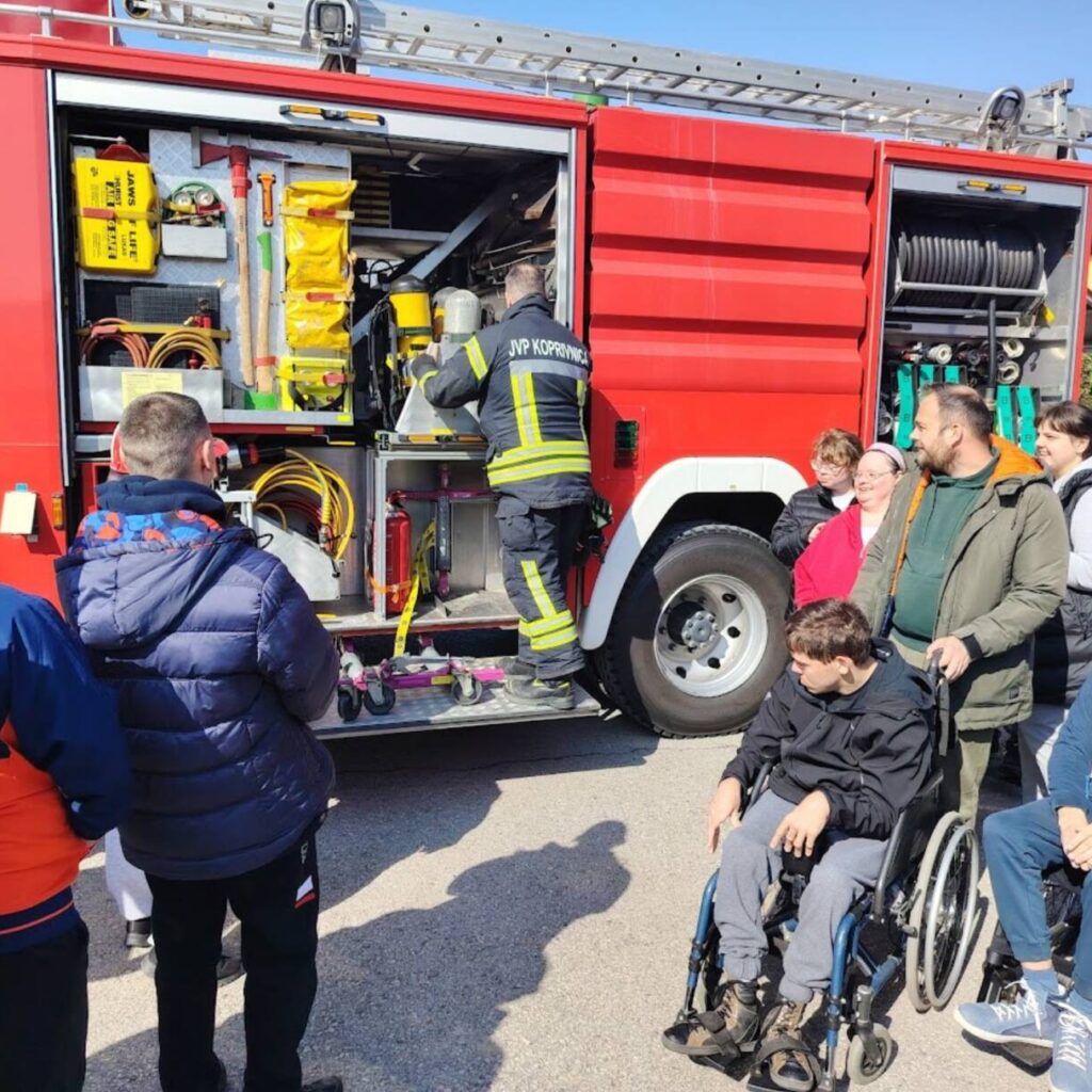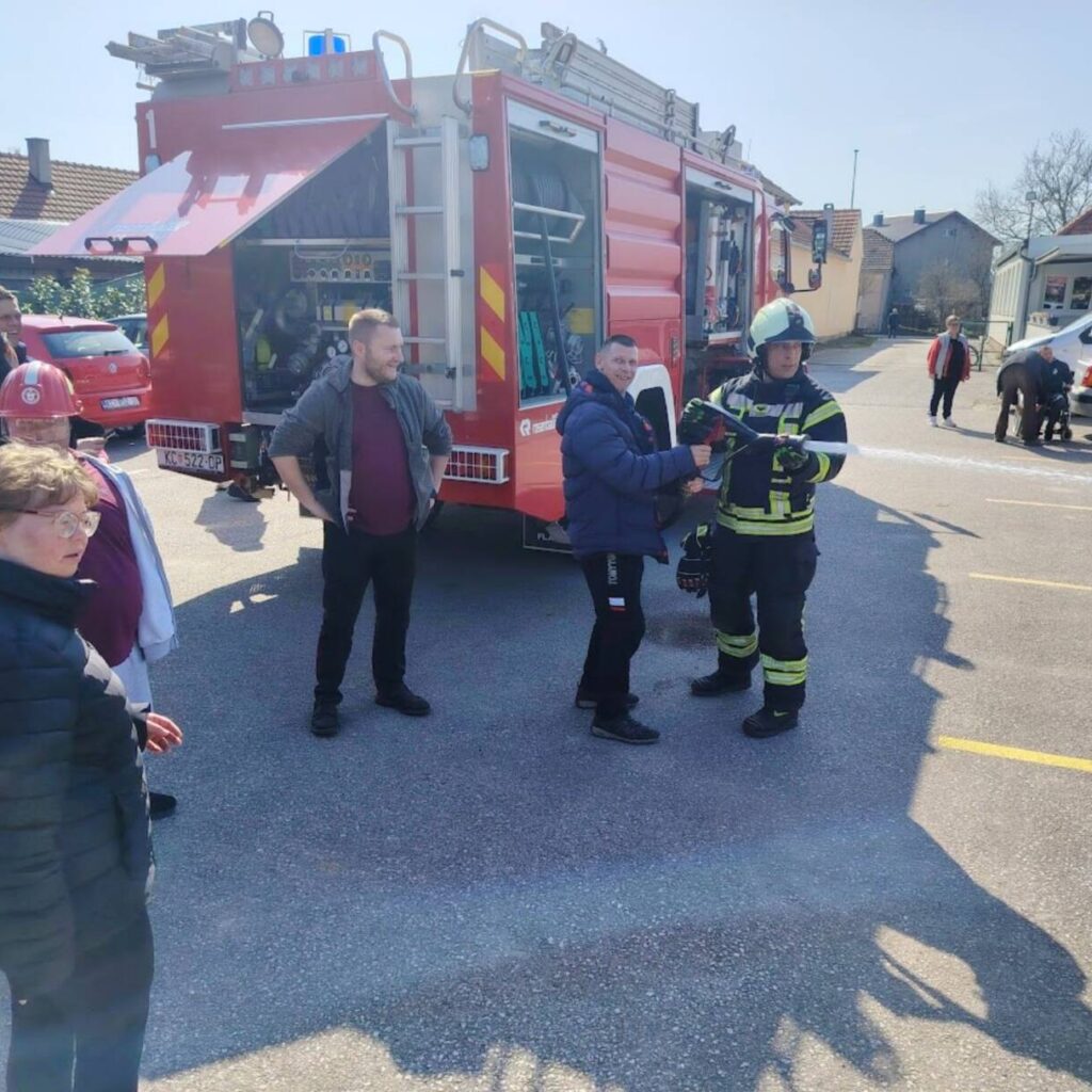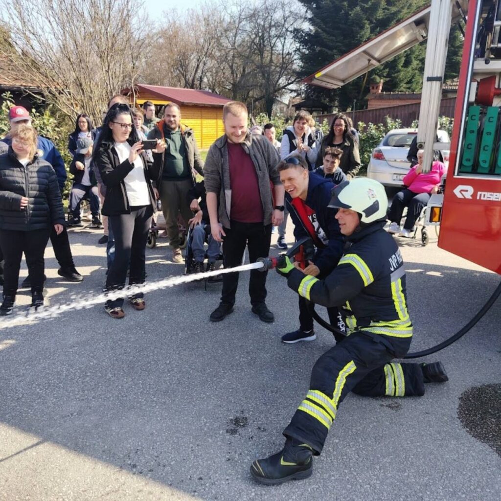 Prekrasan dan u srijedu, sredinom ožujka, donio nam je novu energiju za učenje! U Latice su došli naši prijatelji, vatrogasci Nikola i Antonio iz Javne vatrogasne postrojbe Grada Koprivnice i predstavili nam svoj posao, opremu i način rada. Uz mnogo razgovora i zabave objasnili su nam sve o svom zanimanju, pokazali nam uređaje i pomagala na vatrogasnom kamionu, a veliko uzbuđenje kod nas je izazvala prilika da isprobamo pustiti vodu iz vatrogasne mlaznice. Nakon ovako uzbudljivog doživljaja, opustili smo se uz pjesmu i zabavu, a naši prijatelji vatrogasci su nam poklonili bojanke i brošure vezane uz njihov posao. Ovakav tip interaktivnog rada na otvorenom ojačava naše samopouzdanje te pruža priliku za uključivanje u svakodnevicu. Već sad smo nestrpljivi u očekivanju sljedećeg susreta, hvala dečki, još jednom ste nas inspirirali za stjecanje novih iskustava.